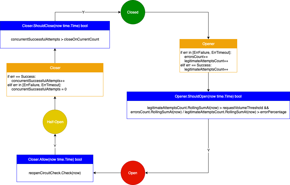 OpenToClosed.Allow(now time.Time) bool根据一定概率返回 true,断路器进入“半打开”状态 - 如果调用失败了,
