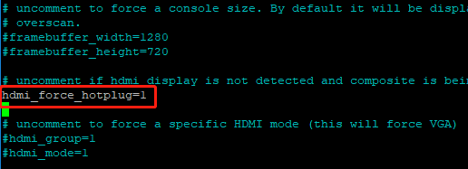 找到hdmi_force_hotplug=1这一行,把前面的#号删除掉,请以图片为准。